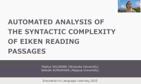 |  | Automated Analysis of the Syntactic Complexity of EIKEN Reading Passages Maelys Salingre, Shizuoka University (Japan) Satoshi Kurokawa, Nagoya University (Japan) |
